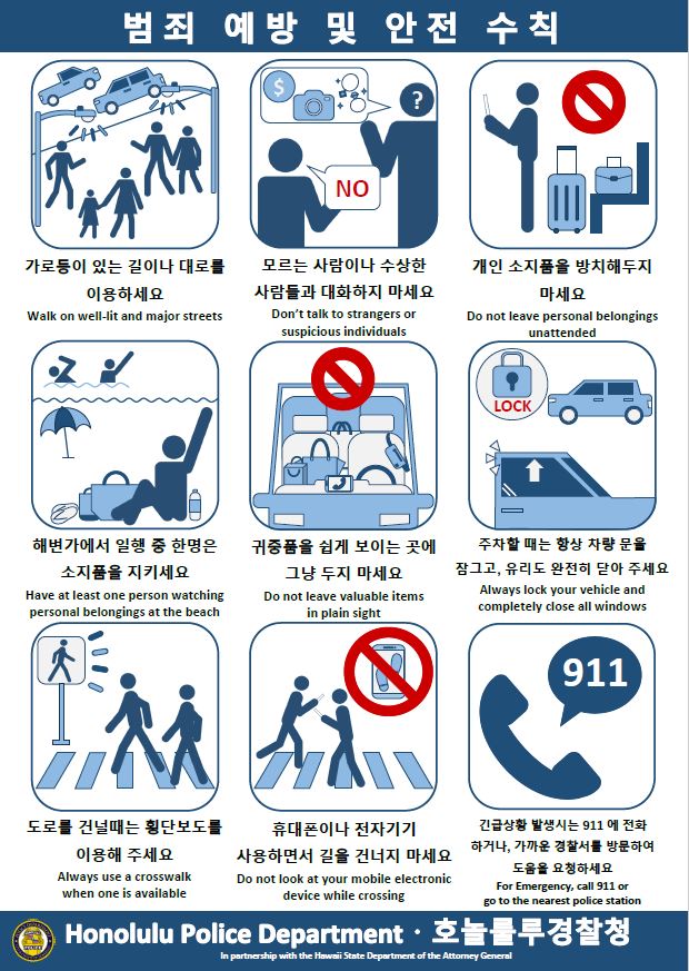주호놀룰루총영사관과 호놀룰루 경찰청이 협력 제작한 여행객 범죄 예방 및 안전 수칙 포스터를 공유하오니